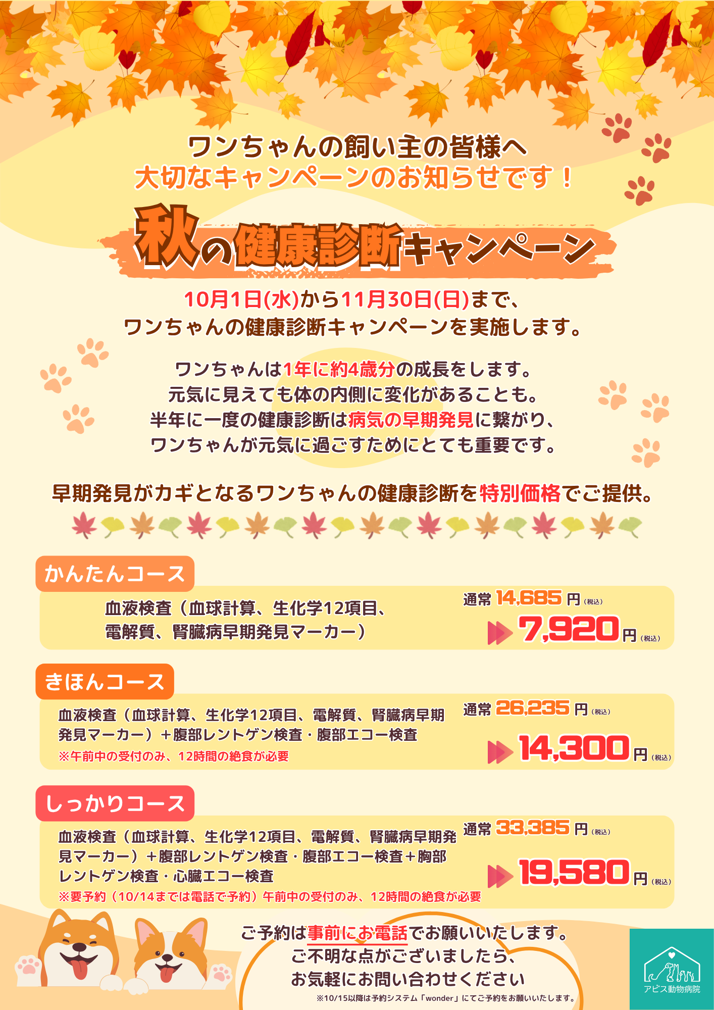 ワンちゃんの10月、11月健康診断キャンペーンのお知らせ