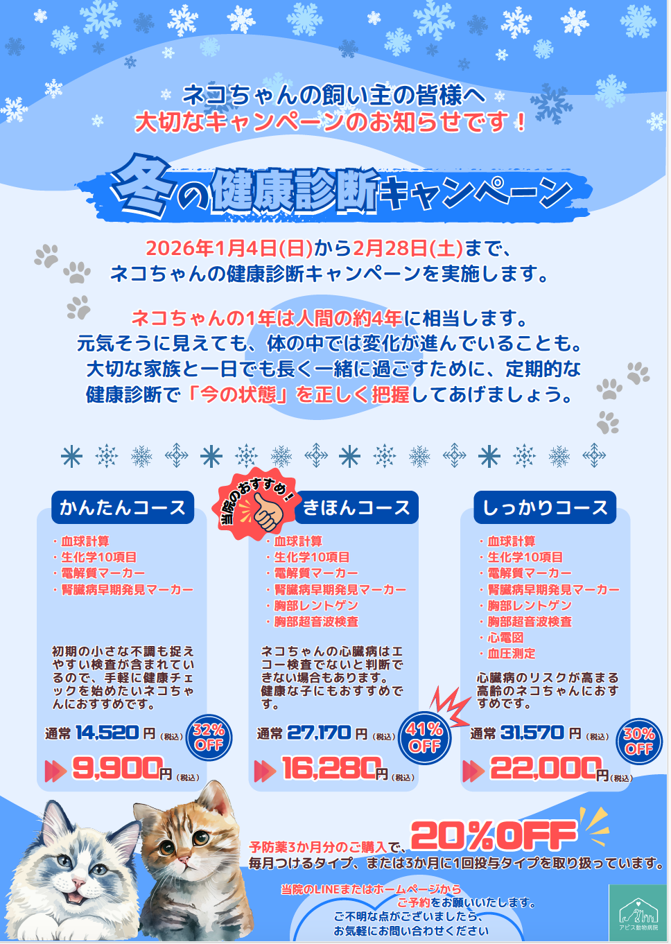 ねこちゃんの冬の健康診断キャンペーンのお知らせです。