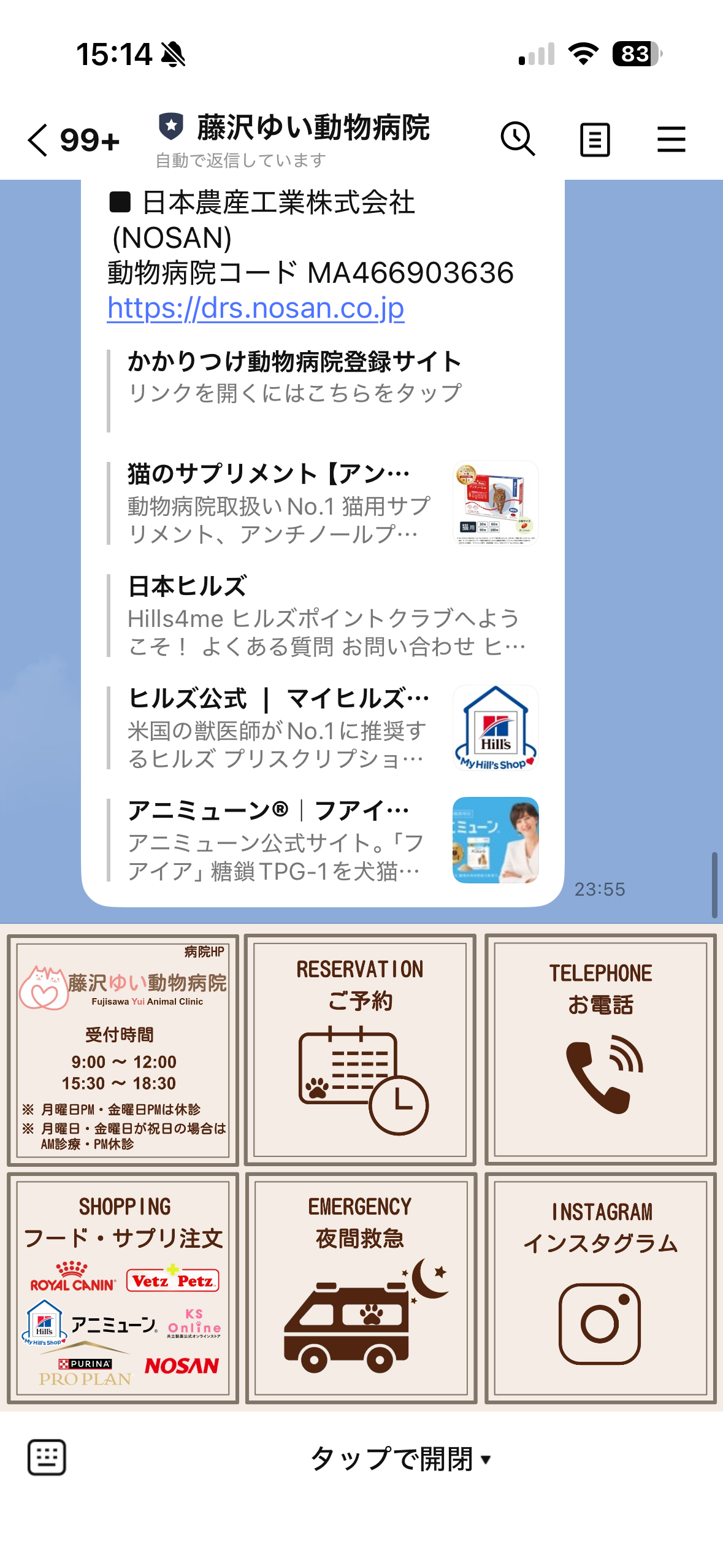 1.上記の藤沢ゆい動物病院のLINEトーク画面を開き、メニュー上段中央の【ご予約】をタップします。