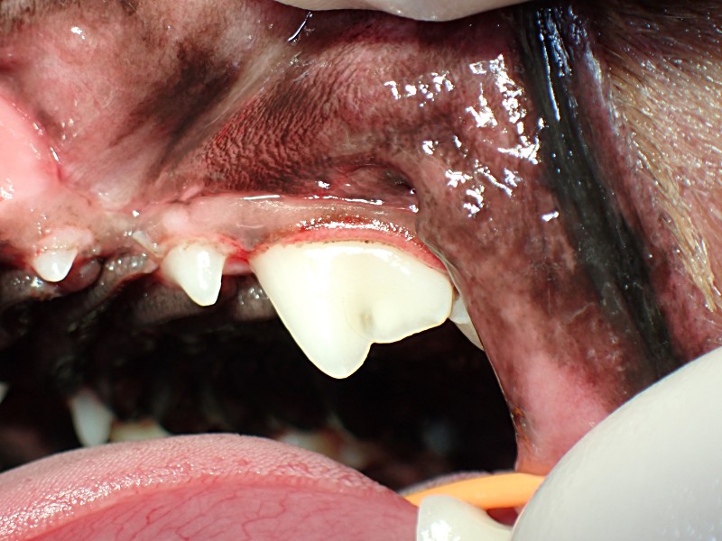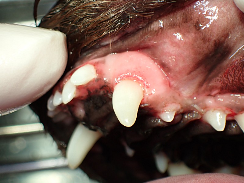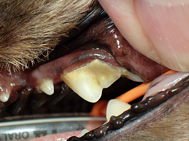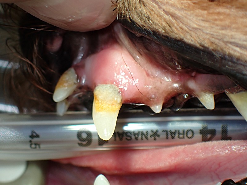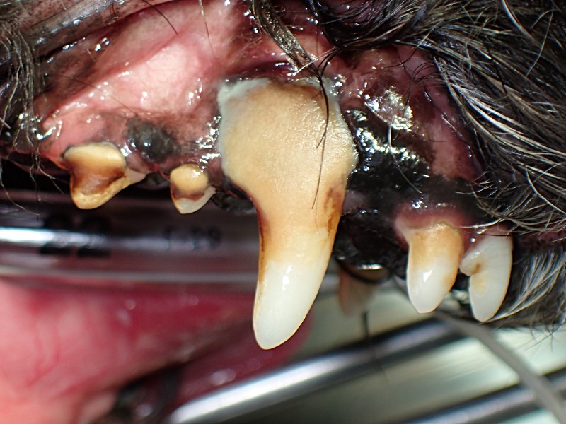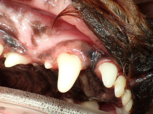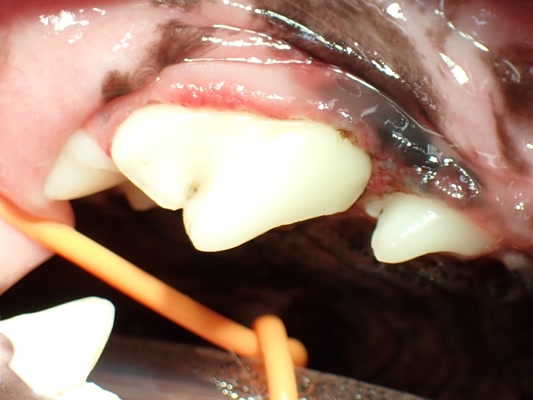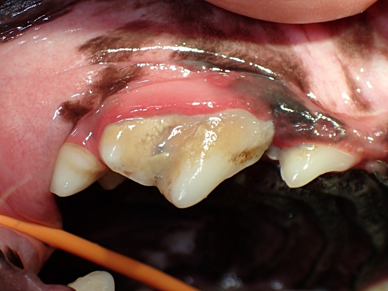 犬歯は歯石の細菌の影響で歯肉が上に退行してしまっています。