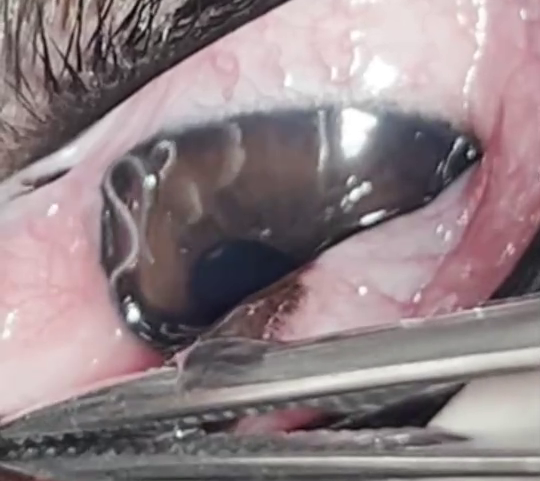 この後に、目ヤニの顕微鏡画像、麻酔下の眼虫摘出動画、摘出後の眼虫画像を掲載します。苦手な方はご注意ください。