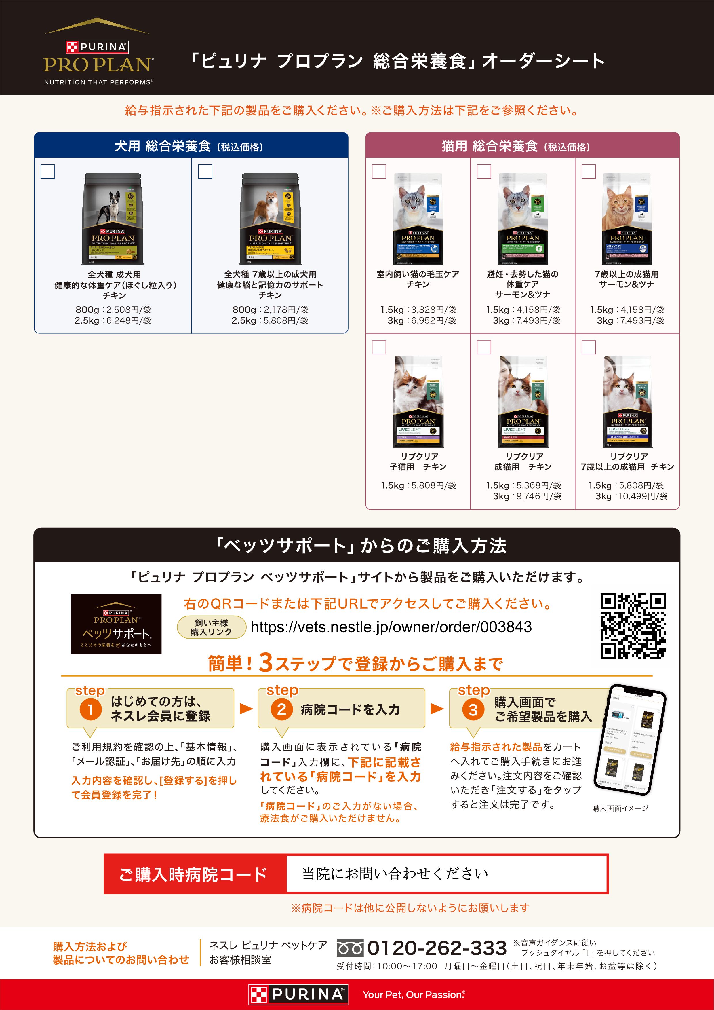 ピュリナ・プロプランの処方食、動物病院用一般食は、もちろん当院でご注文いただき購入可能ですが、ピュリナのメーカー直販オンラインショップ【