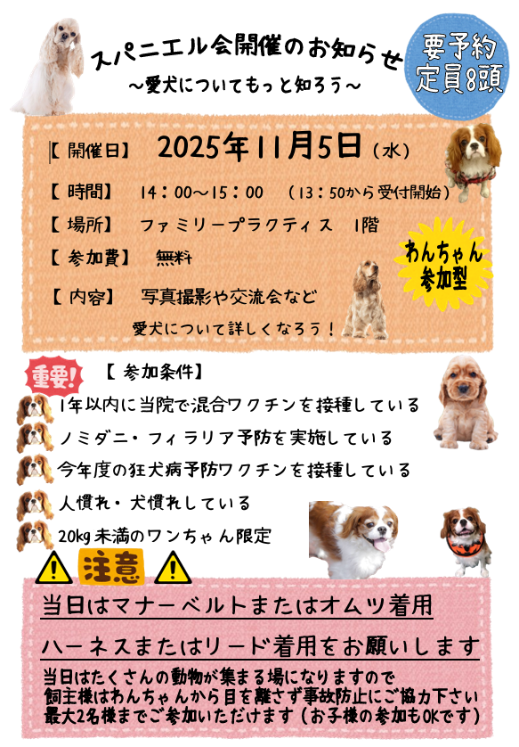 当日は獣医師よりスパニエル系のかかりやすい病気や特徴のお話、クイズ大会、
