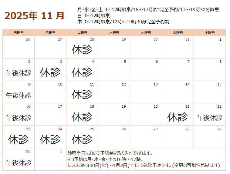 ※休診日は変更になる可能性があります。ご了承ください。