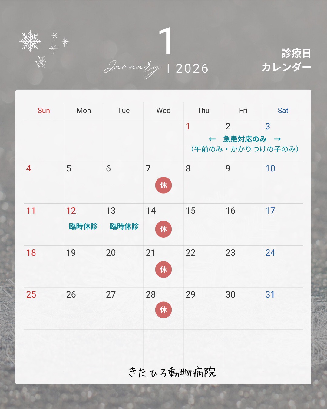 1月の休診日のお知らせです。お間違えのないようご留意くださいませ。