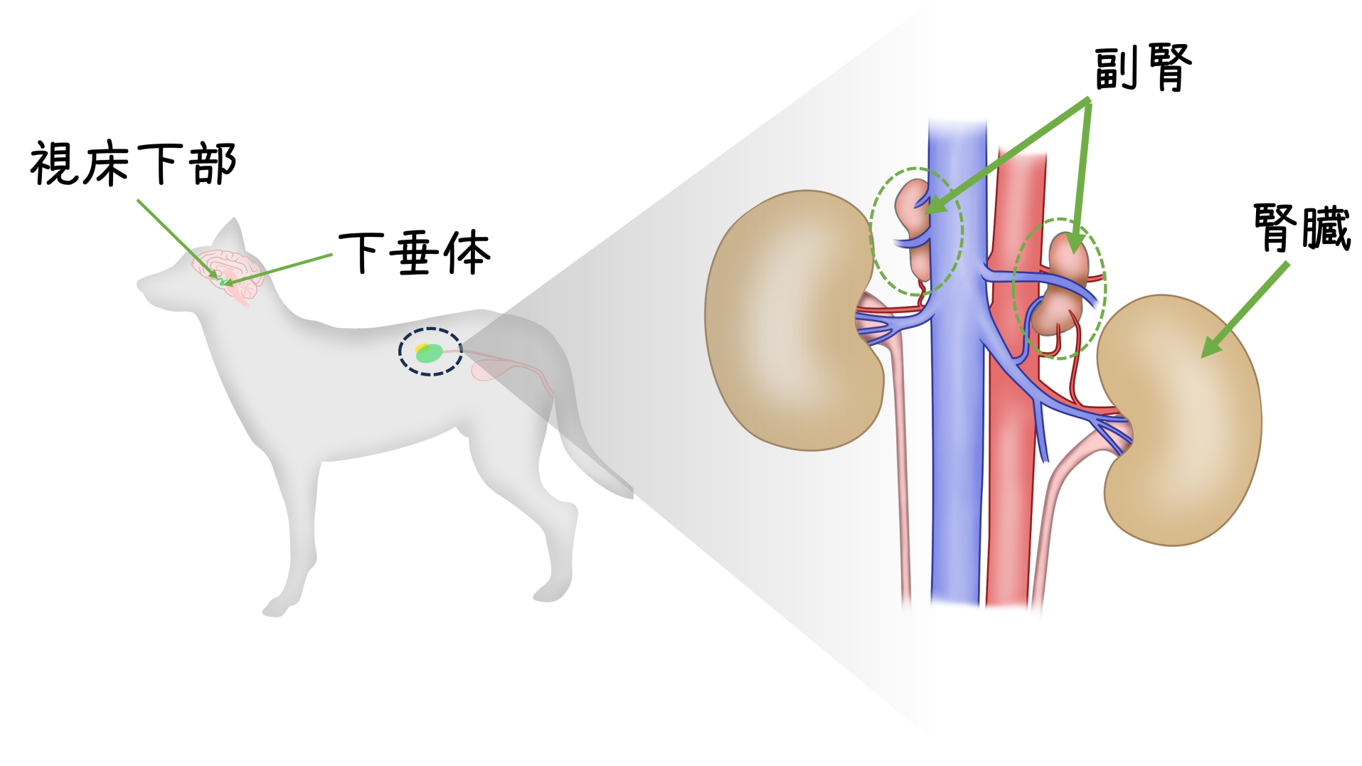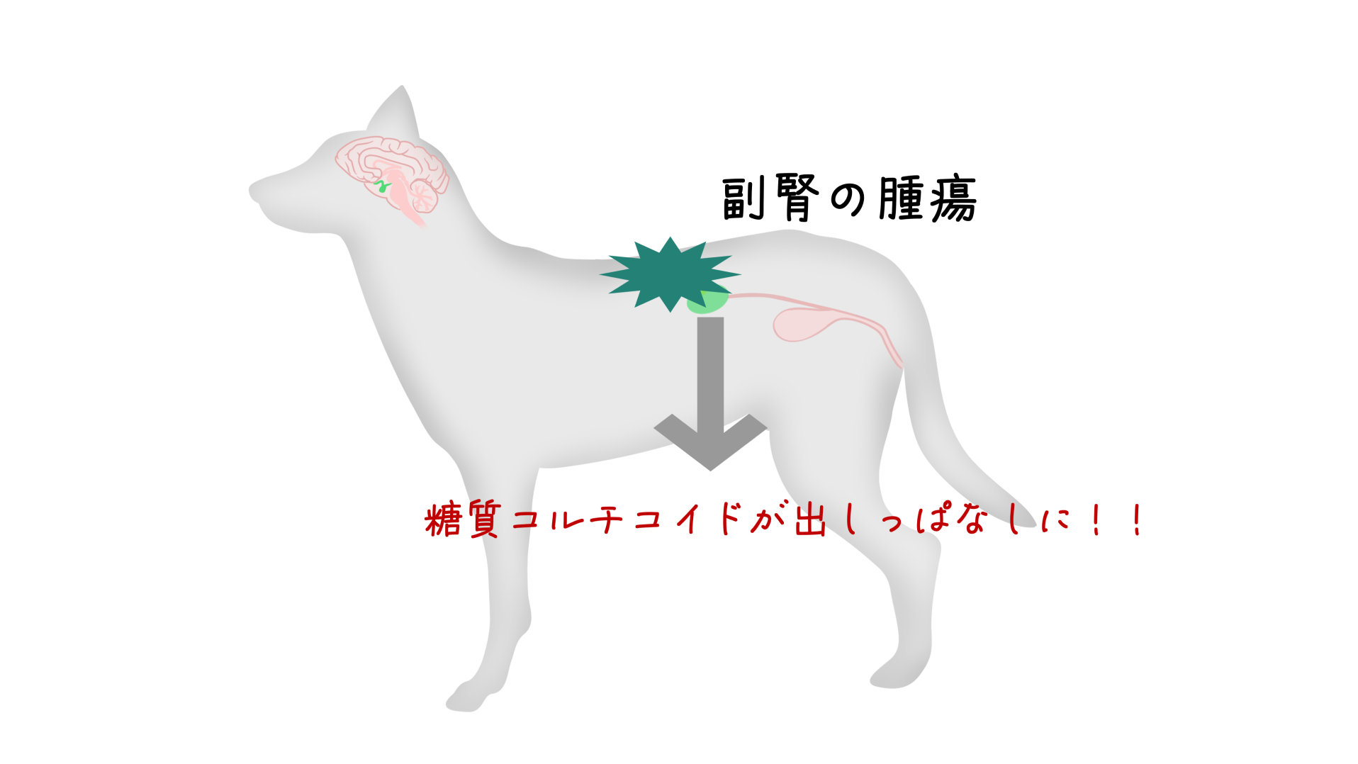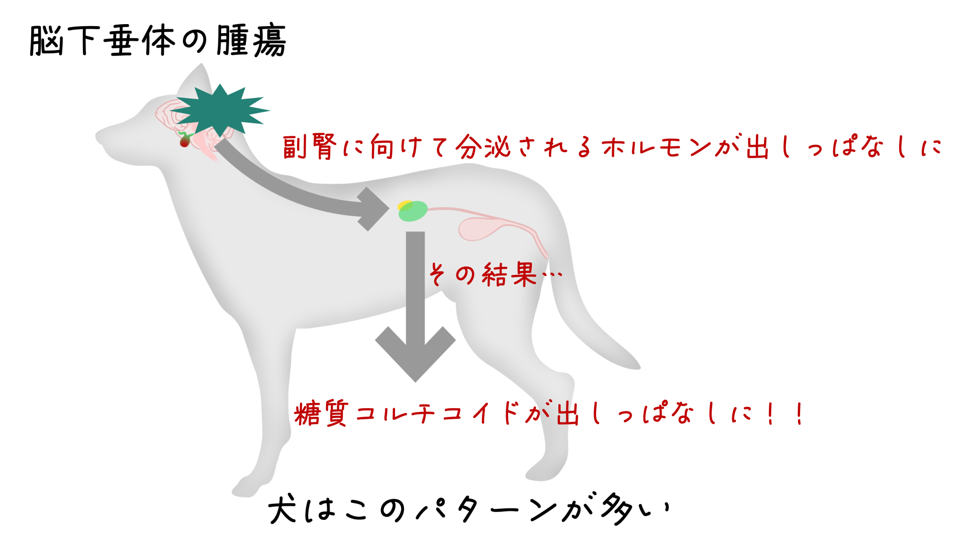 脳下垂体の異常脳下垂体に腫瘍ができることで、副腎に向けて分泌されるホルモン(副腎皮質刺激ホルモン)が出しっぱなしになります。この間違った指令を受けた副腎皮質から糖質コルチコイドが出しっぱなしになります。犬のクッシング症候群では、このパターンが約80~85%を占めています1)。