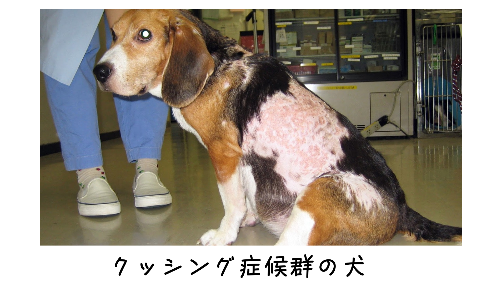 最初に現れる症状は、水を飲む量が増える、おしっこの量や回数が増える、そして食欲が旺盛になることですが、「中年を過ぎてからよく食べ、よく飲み、元気にしているな」と勘違いされることが少なくありません。そのうちにお腹まわりが太くなり、毛が薄くなり、歩くとハーハー疲れやすくなりますが、「老化だから仕方ない」と見過ごされがちです。