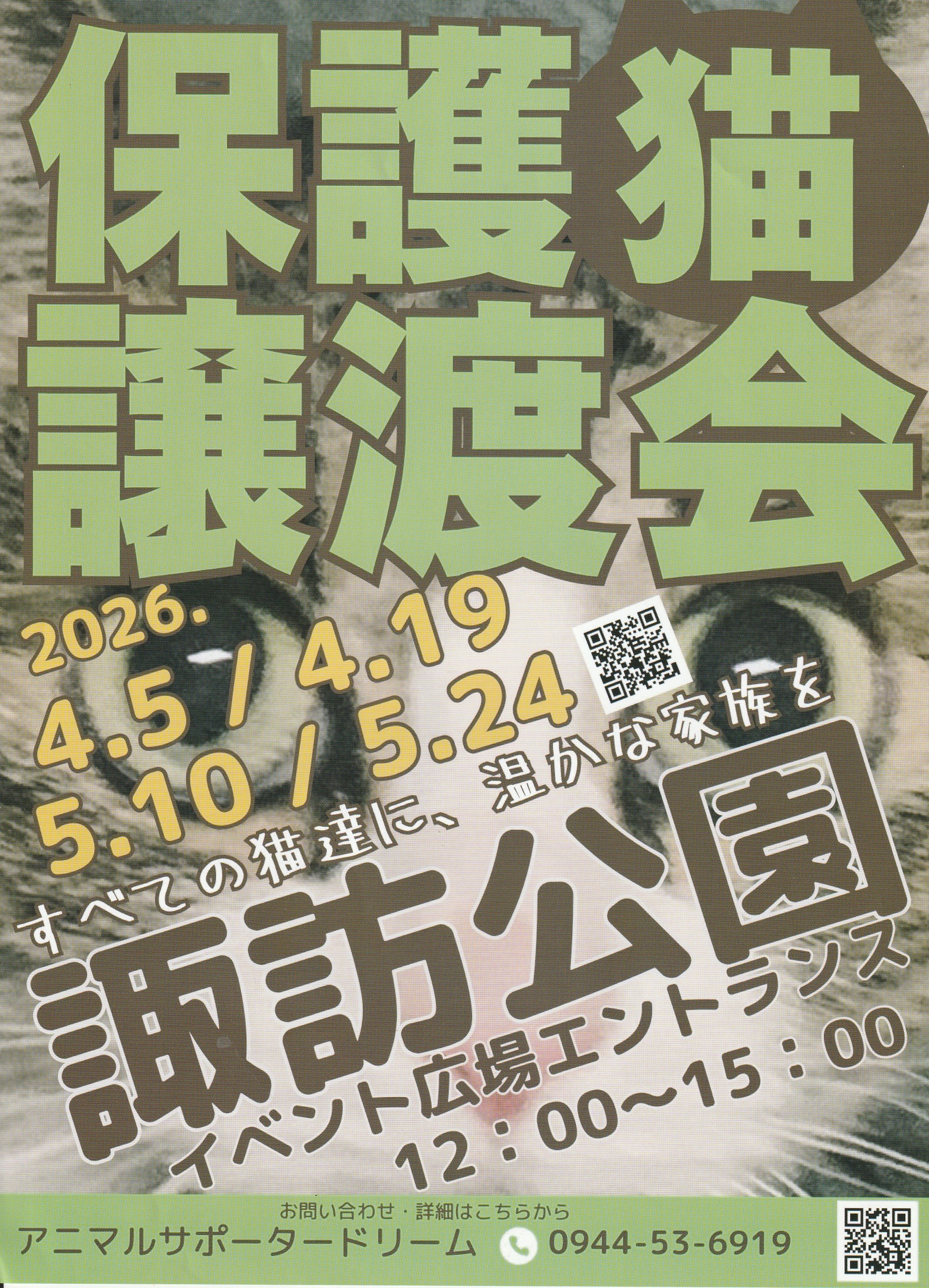 諏訪公園で保護猫の譲渡会が下記の日程・時間で開催されます。ご関心のある方は参加のほどよろしくお願いいたします。