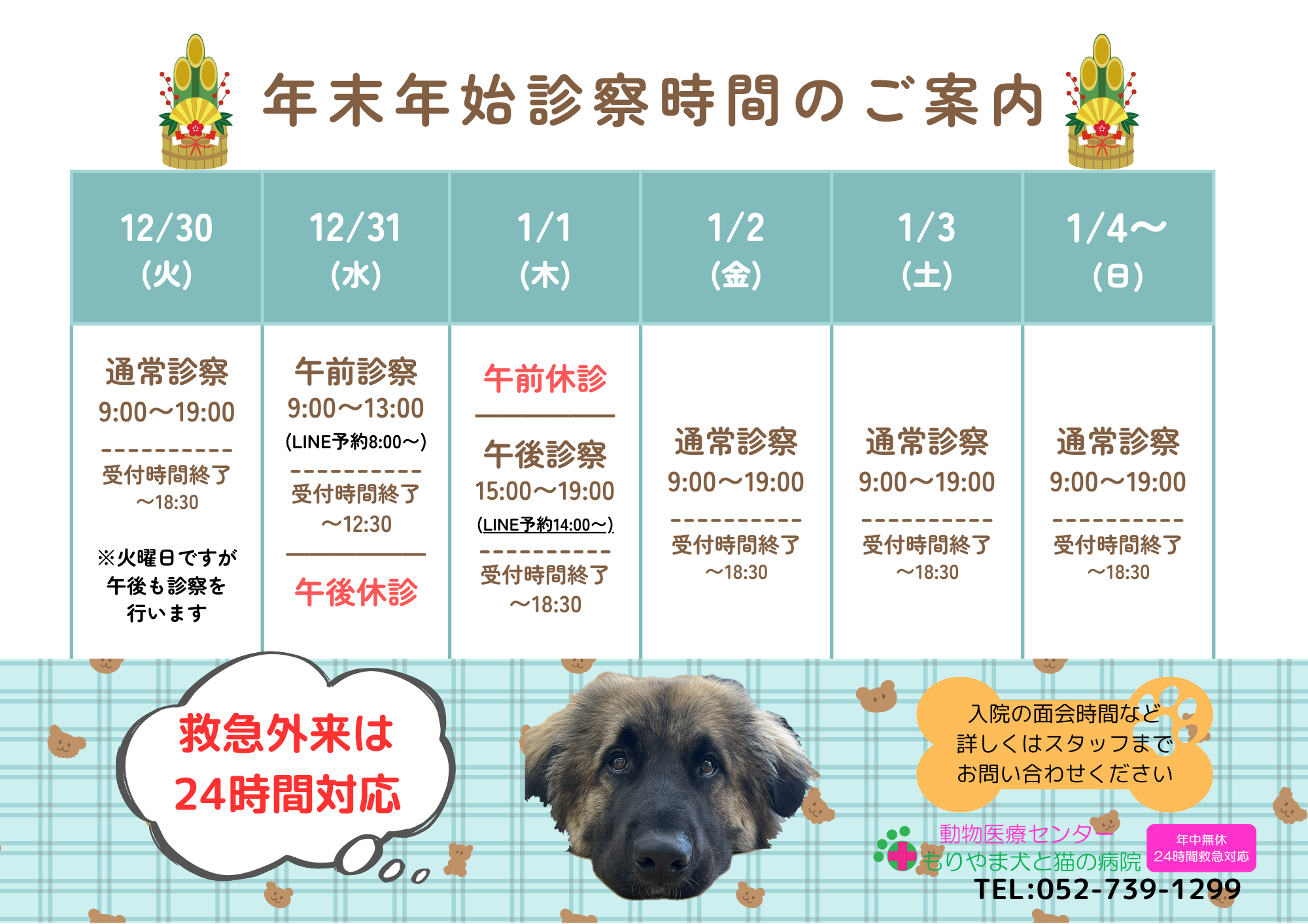 12月31日(水)・1月1日(木)の2日間のみ、年末年始の診察時間となります。