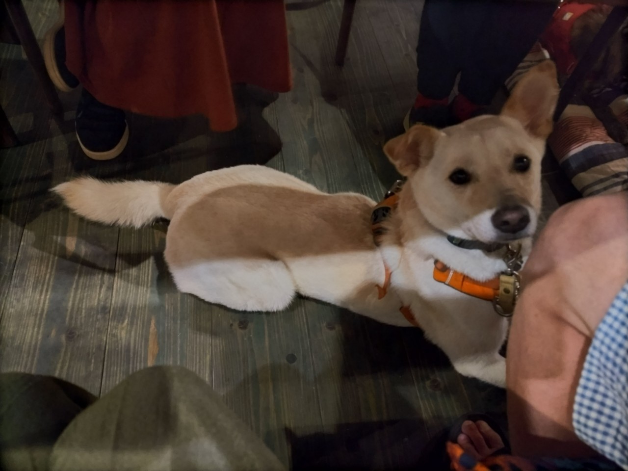 いざ到着して会場を見渡すと後ろを振り向き私の顔を見て、「母ちゃん、ボクだけとちゃうやん。なんやいっぱい犬も人もおるで!どゆこと?」としっぽをシュルンと下げ不安そうに言っているようでした😥