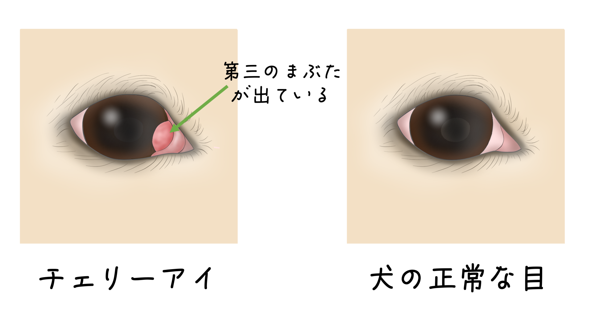 チェリーアイは見た目の変化が分かりやすいので、ご家族も気づきやすい病気です。片目だけのこともありますが、後から反対側の目に起こることも、両目に起こることもあります。