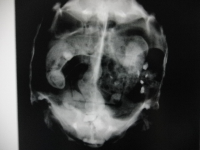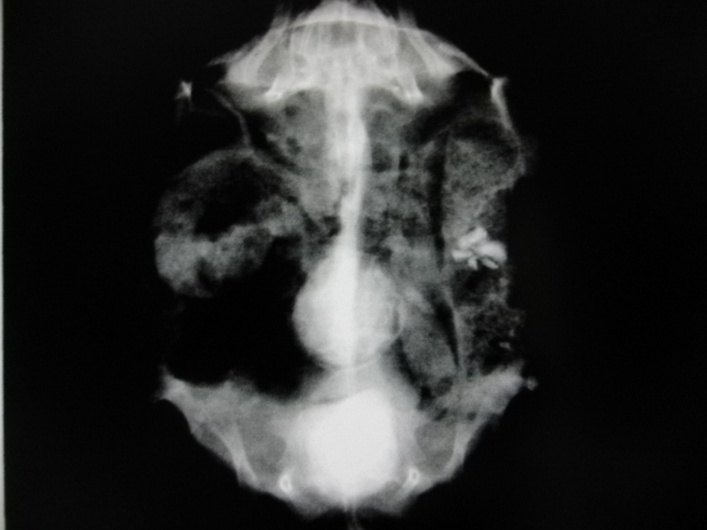 下のレントゲン写真の子は、膀胱内と総排泄腔に結石を認めました。