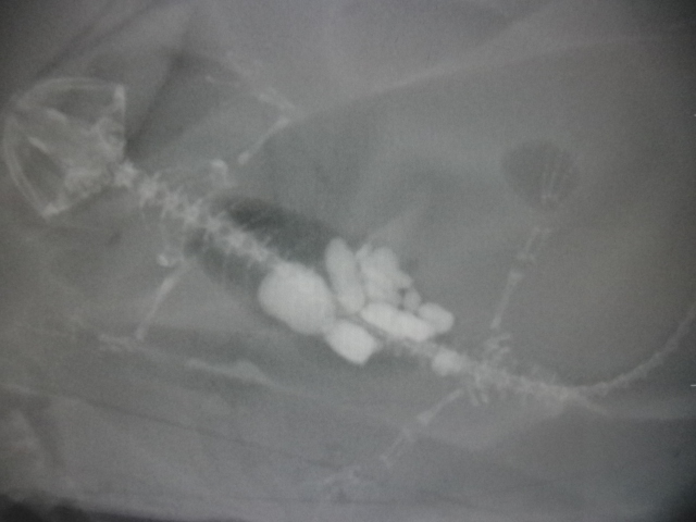 この子はX線写真の通り、底石を複数誤食してしまい食欲が低下していました。