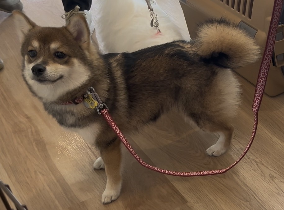 ★逸走時は赤いリード・ハーネスを付けた状態で、避妊手術後のため、ピンクの術後服を着ていました。